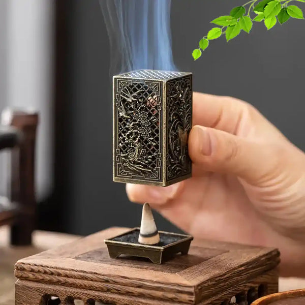 Alloy Square Vertical Incense Burner - Plum, Orchid, Bamboo, Mum Hollow Design