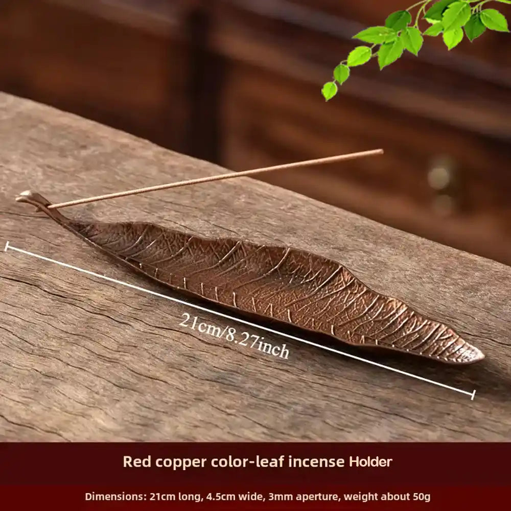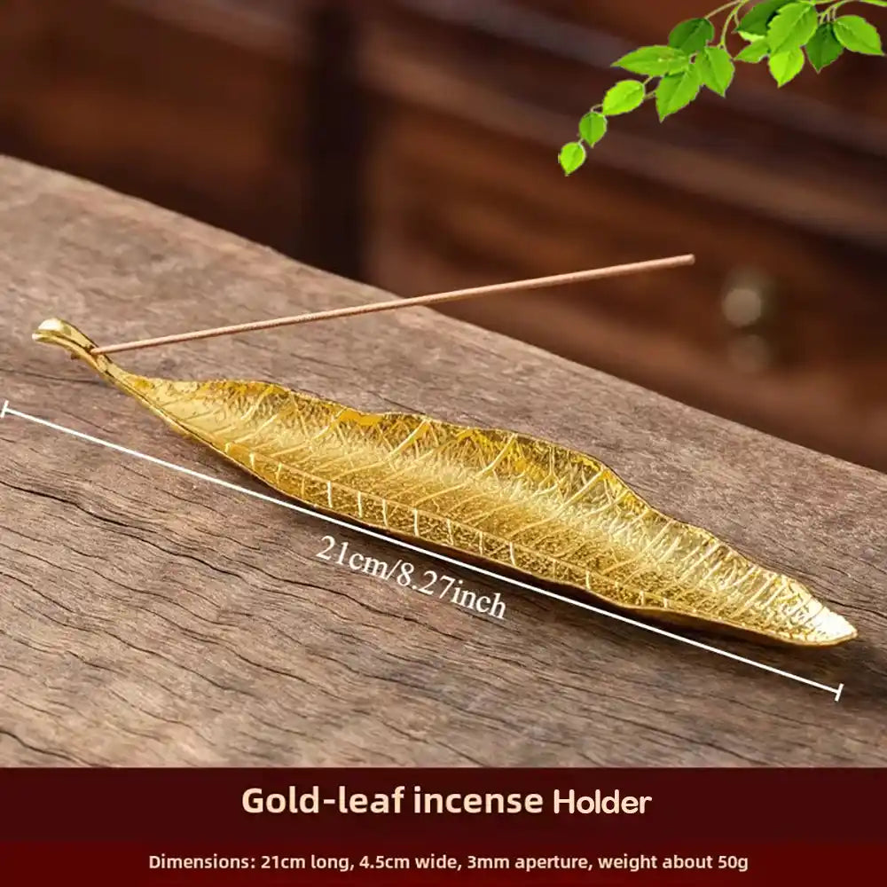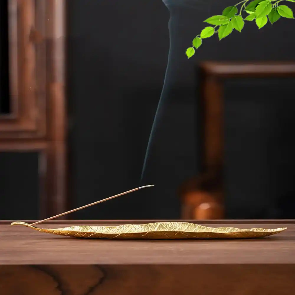 Porte-encens en métal en forme de feuille dorée aux nervures délicates. Conçu pour les bâtonnets d'encens, sa forme élancée permet un dépôt propre des cendres et apporte une touche zen apaisante aux bureaux, salons de thé ou espaces de méditation.