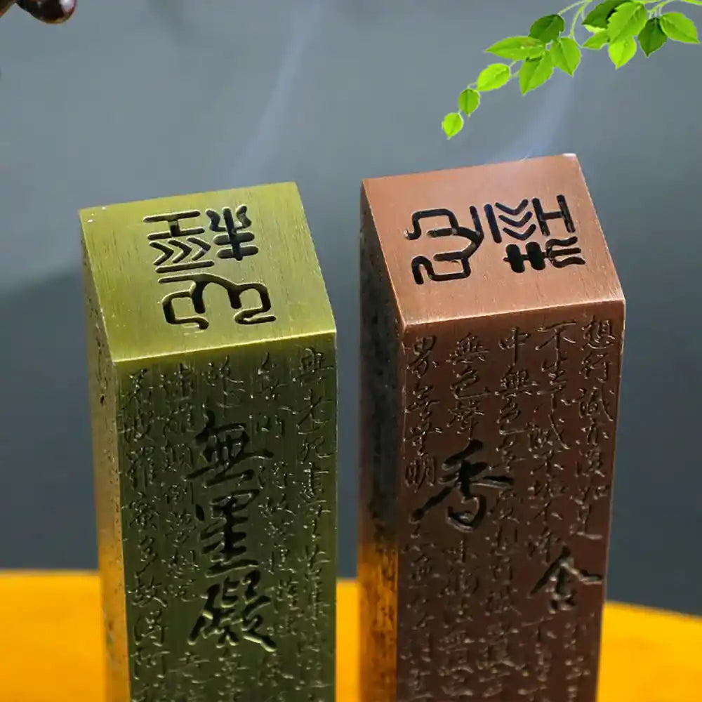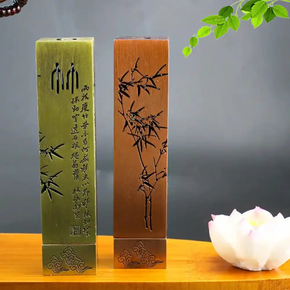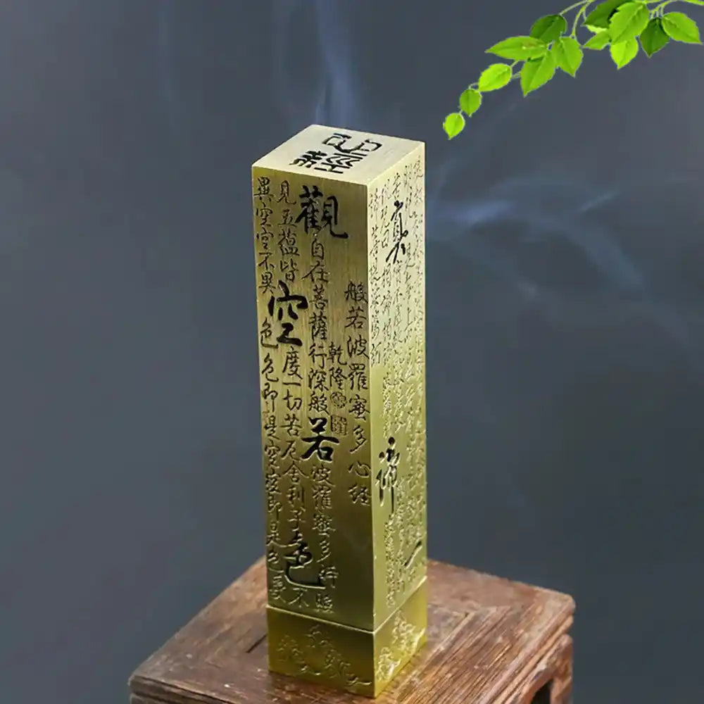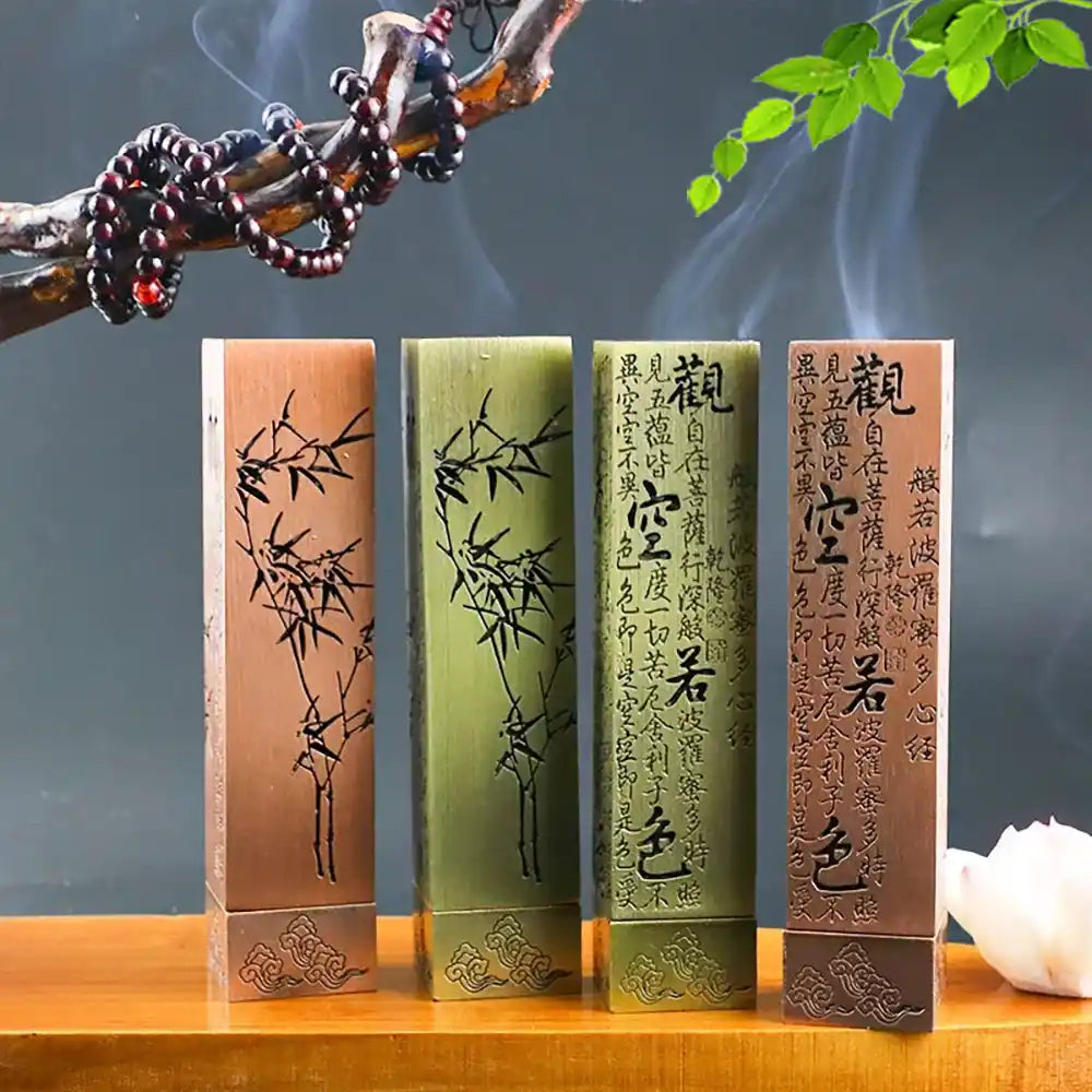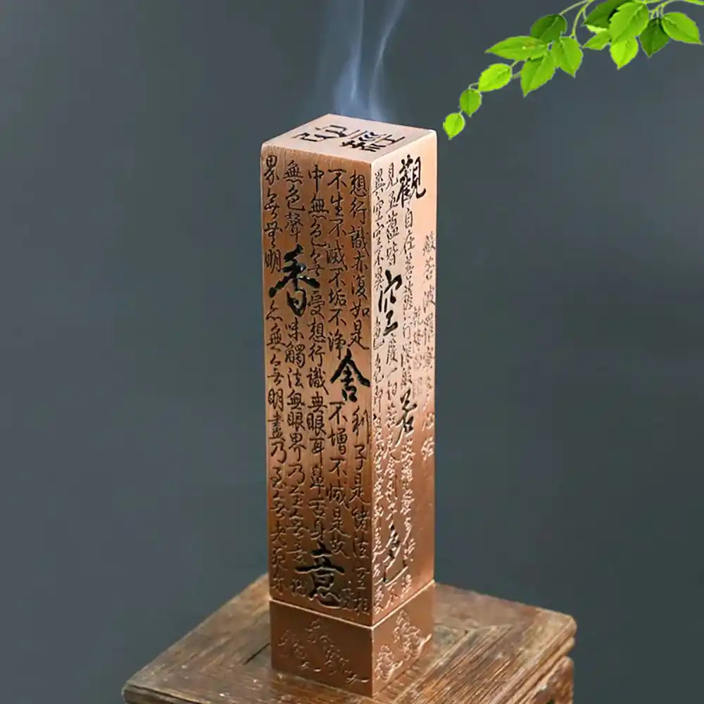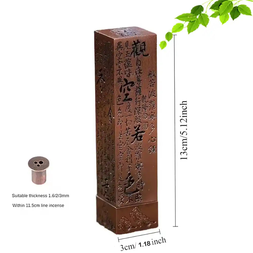 Porte-encens vertical en alliage de cuivre, orné de motifs ajourés représentant le Sutra du Cœur ou le bambou. Conçu pour les bâtonnets d'encens jusqu'à 11,5 cm, il assure une stabilité optimale et apporte une touche raffinée aux salons de thé, espaces de méditation ou à la décoration intérieure.
