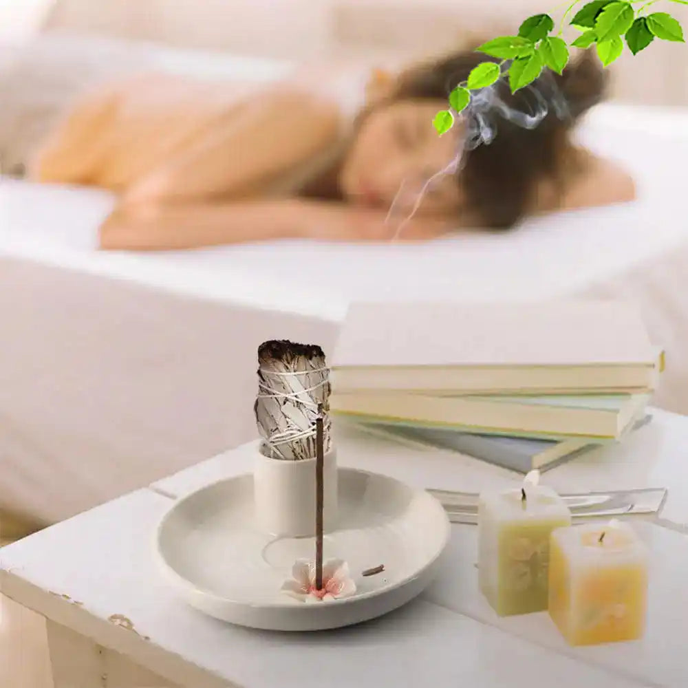 1.Enhance Your Ambiance: Elevate your space with our sage burner, featuring a sophisticated design that combines flower-shaped and cylindrical incense holders with a water corrugated tray. Create an inviting atmosphere while minimizing mess.