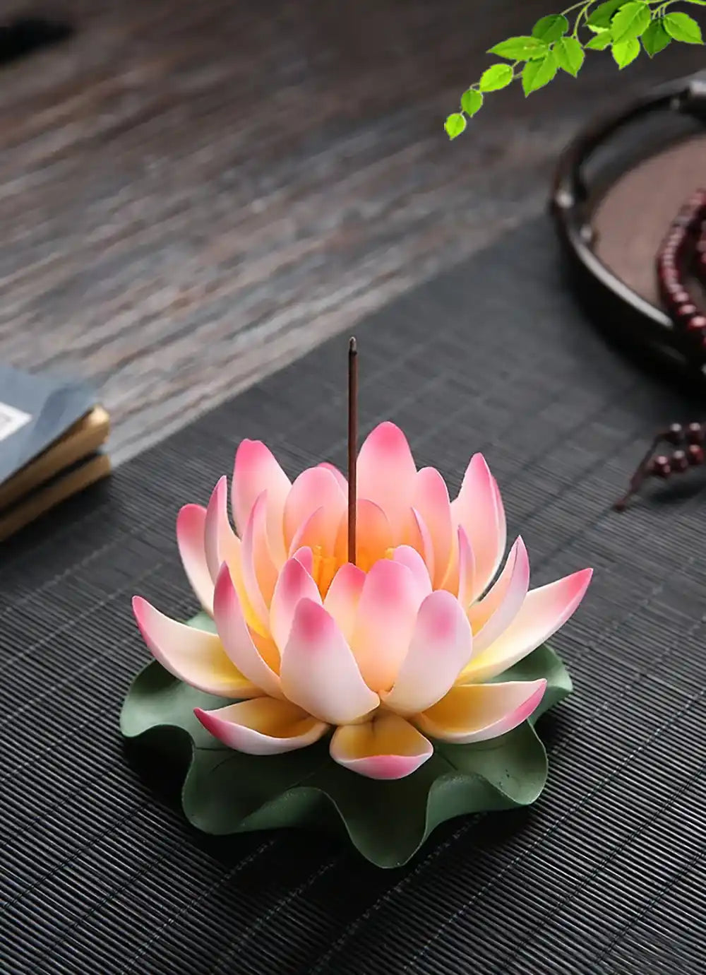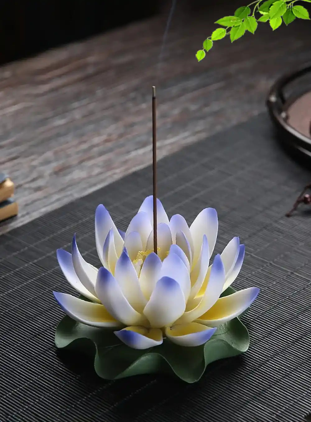 Featuring a detailed lotus design, this incense holder adds a touch of tranquility and spiritual elegance to your space, enhancing any room with its calming aesthetic. -