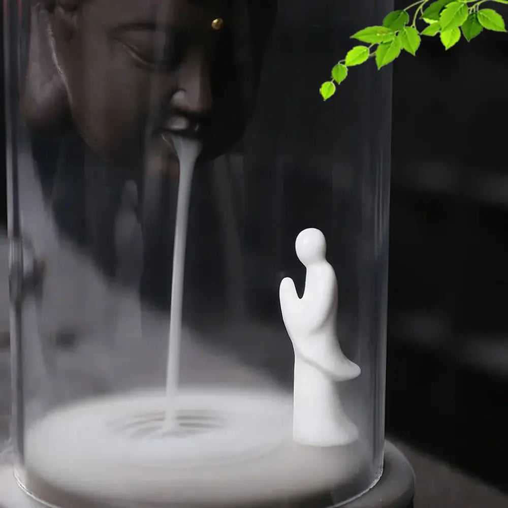 - Cascading Smoke Effect – Smoke flows through the Buddha’s mouth, enveloping the monk in a calming, peaceful mist.